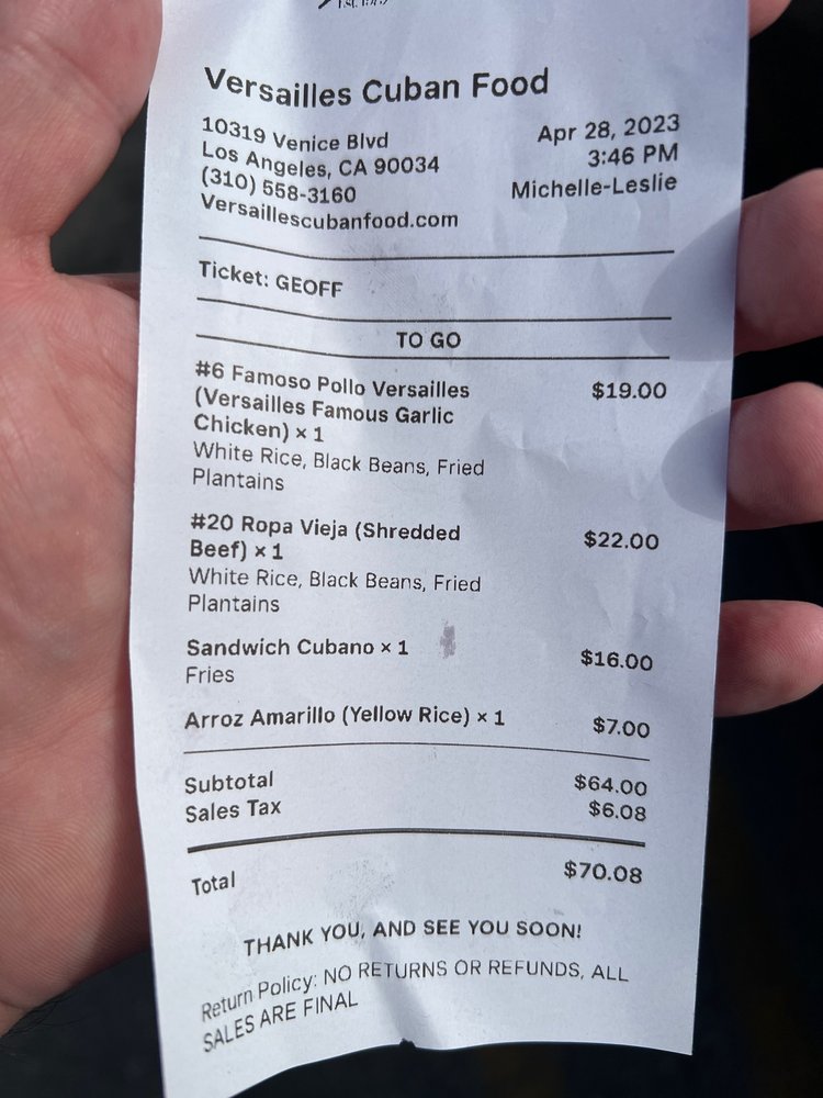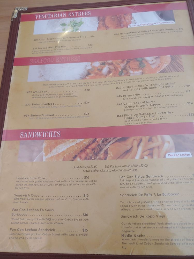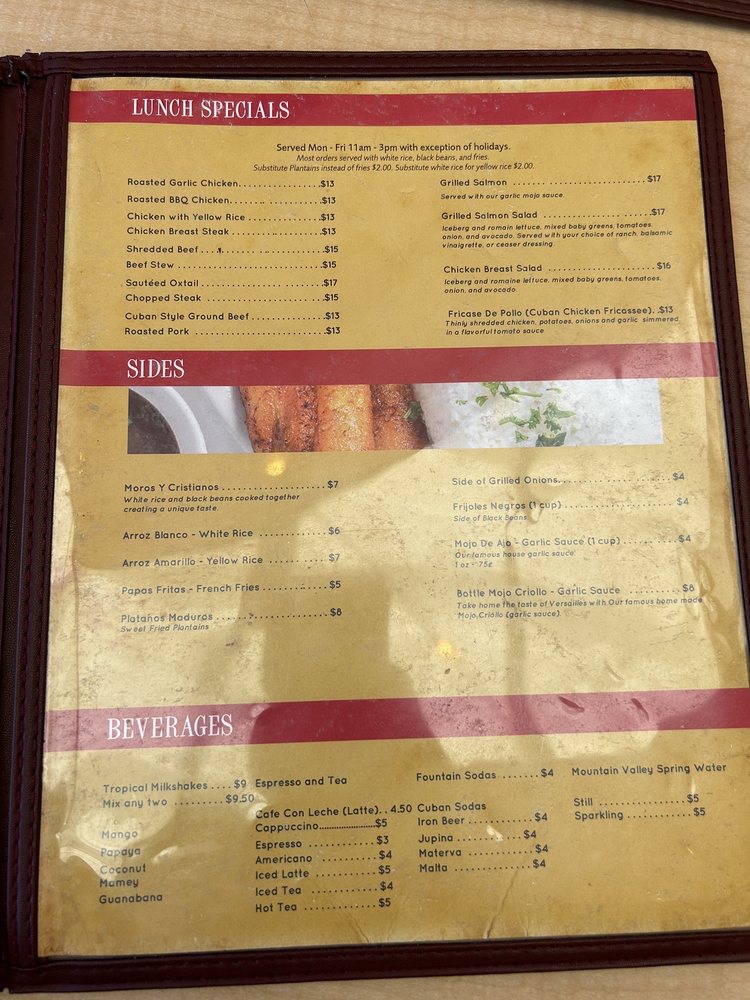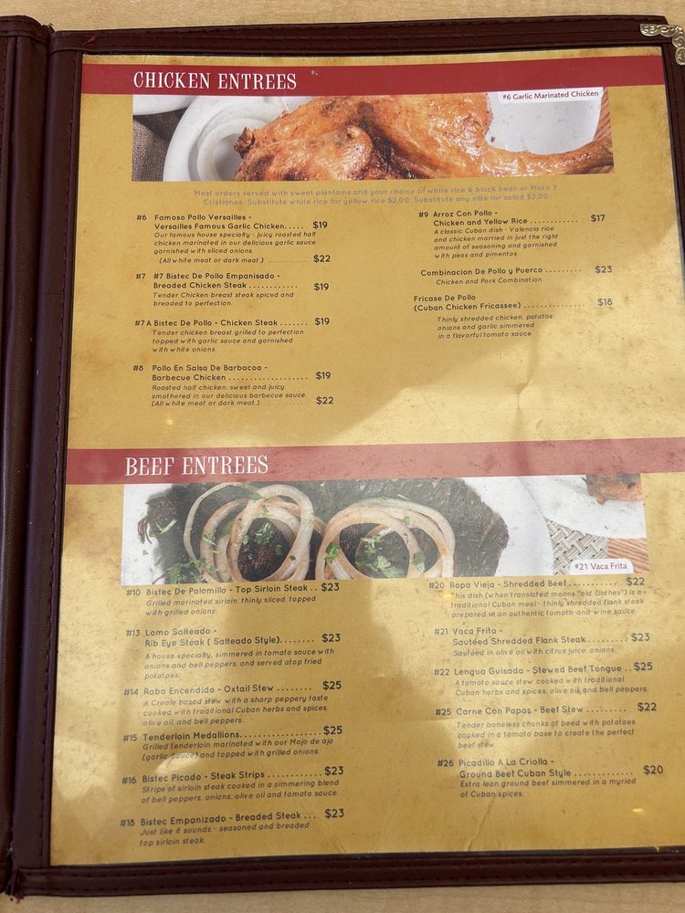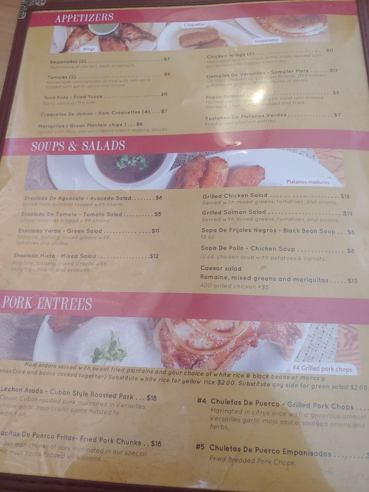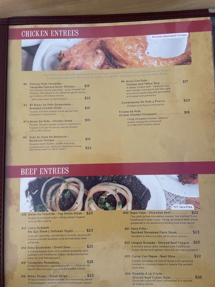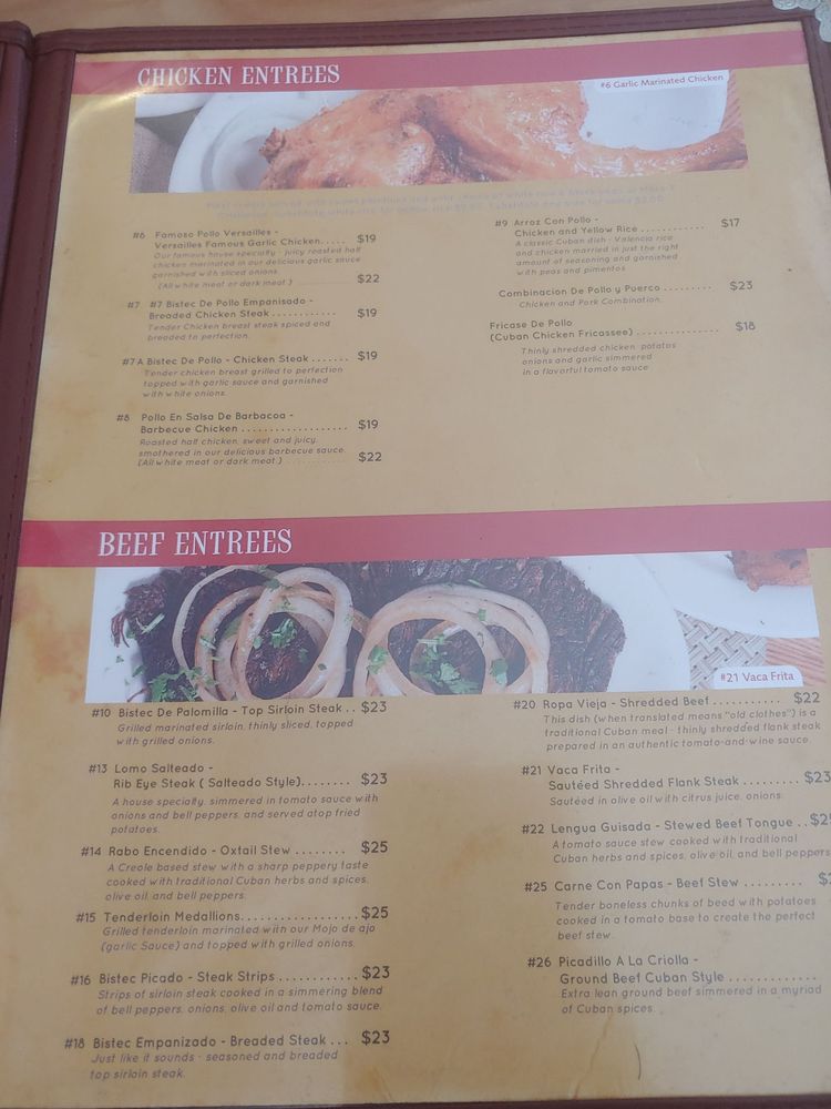 Introducing the menu at Versailles Cuban Food in Los Angeles offers a diverse range of options for customers. From traditional Cuban dishes like Papas Rellenas and Cubano sandwiches to vegan-friendly choices like spinach and beef empanadas, this Latinx-owned restaurant caters to a wide variety of preferences. The Famous Garlic Chicken is a standout dish that receives rave reviews for its consistent quality and flavorful taste. Customers also praise the attentive service and inviting ambiance, making it a great spot for family dinners or larger gatherings. Don't miss out on the complimentary garlic bread and be sure to try the lechon asodo for a juicy and tender meat experience. With options for takeout, delivery, and catering, Versailles Cuban Food provides a satisfying dining experience with a taste of authentic Cuban cuisine.